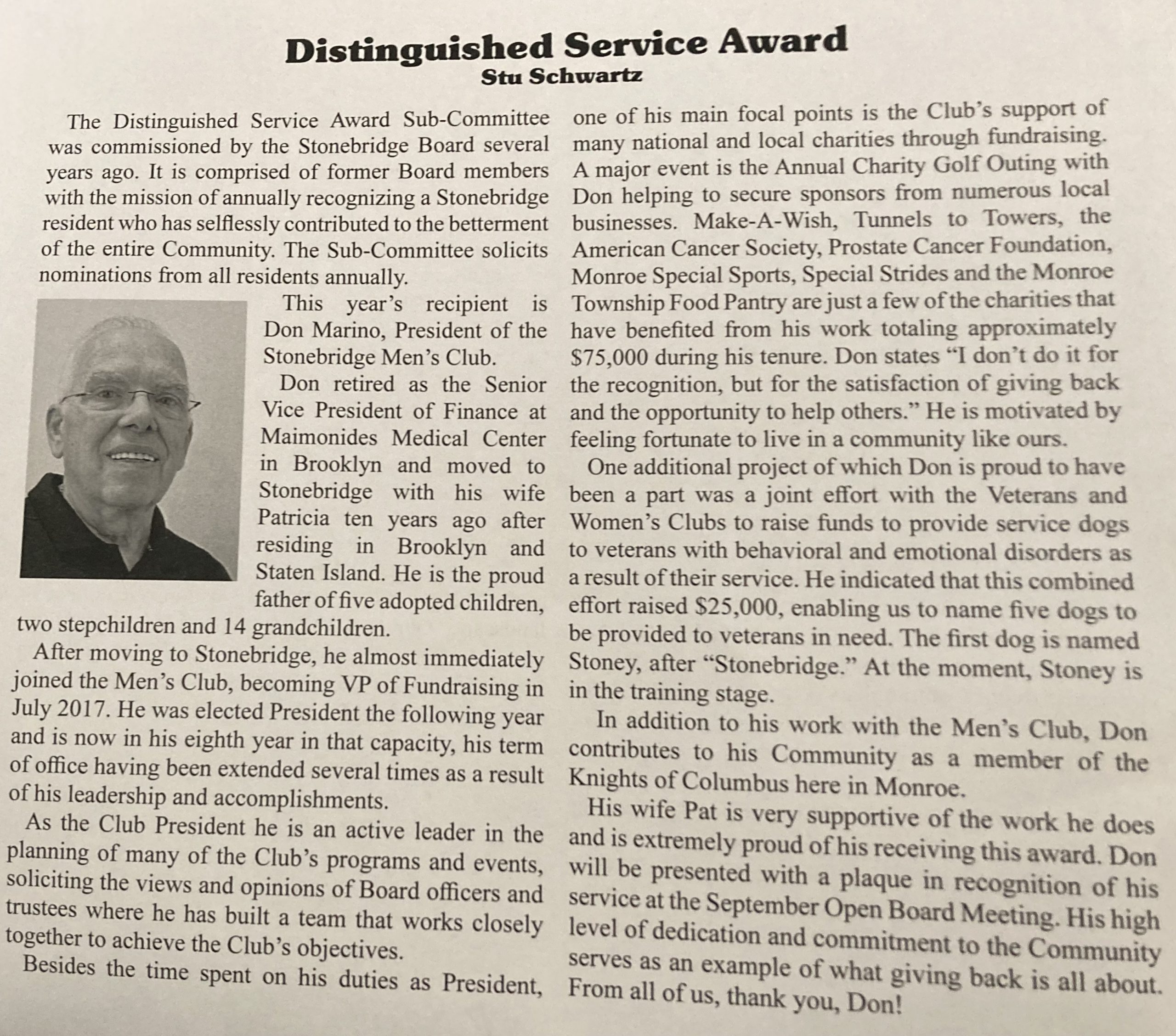 Distinguished Service Award Granted to Our President, Don Marino
